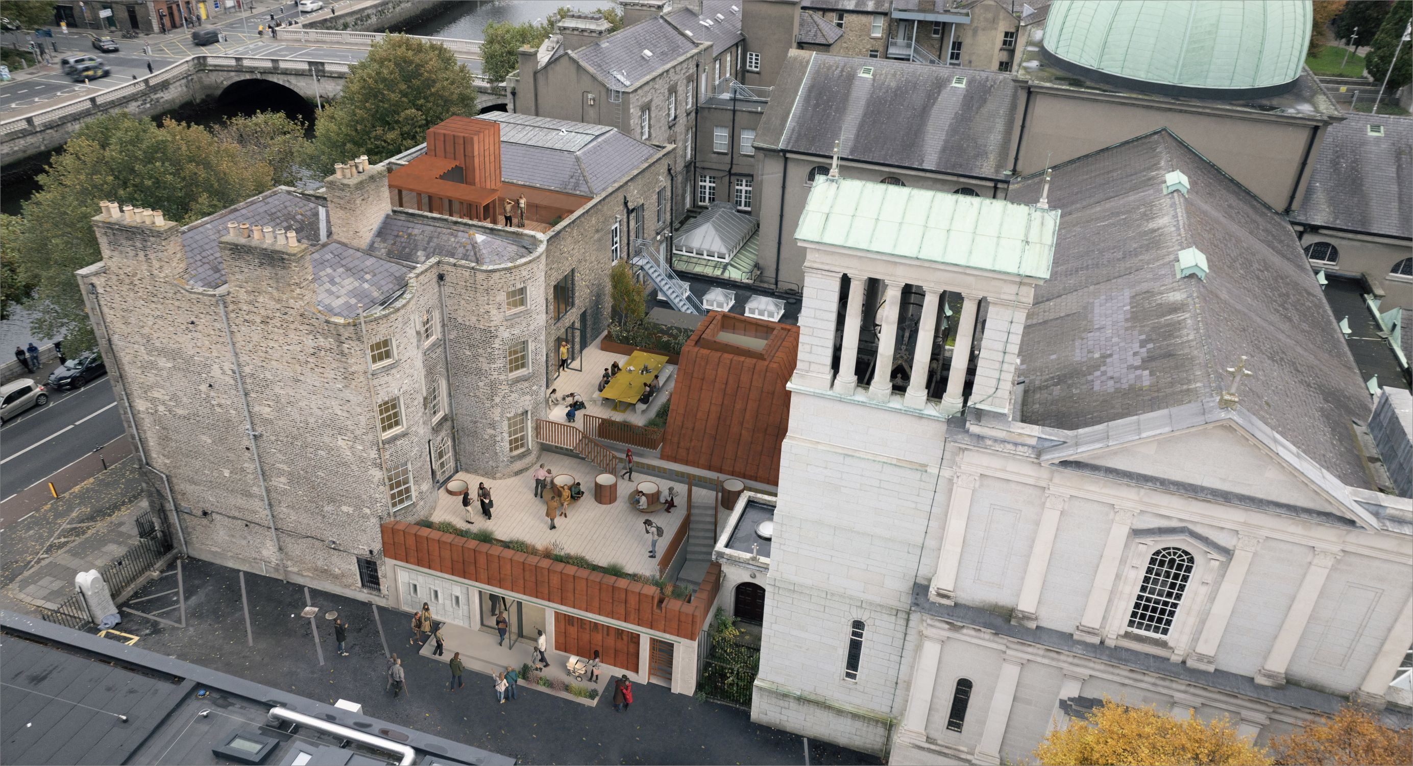 • Provision of external amenity spaces, including a roof terrace at roof level of No. 8 Merchant’s Quay and a first-floor terrace above the restored theatre